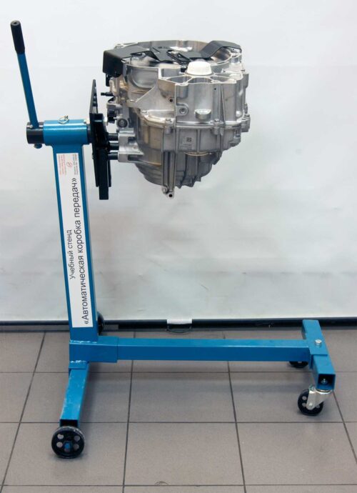 Стенд представляет собой специализированный кантователь, на котором смонтирована новая автоматическая коробка. Коробка передач подготовлена для сборки-разборки.