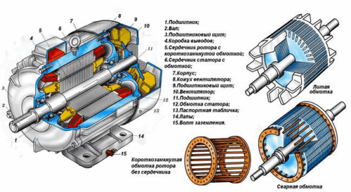 изображение асинхронного двигателя с короткозамкнутым ротором в разрезе с указанием его элементов, мнемосхему, поясняющую принцип действия двигателя;