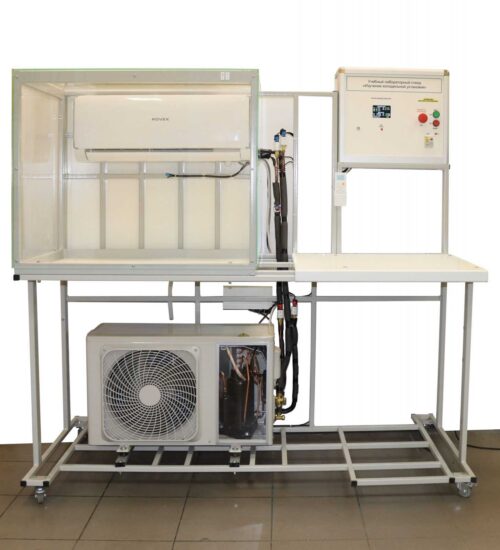 На раме смонтирована холодильная установка. В верхней части рамы установлен испаритель, помещенный в модель комнаты. В нижней части установлен конденсатор. На входе и выходе из испарителя и конденсатора установлены датчики давления и температуры, а также датчик температуры и влажности установлены в модели комнаты.