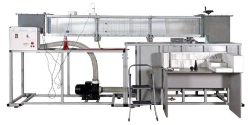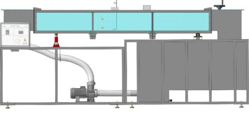 Проточная часть является основным элементам для проведения лабораторных работ. Проток представляет собой, сварную конструкцию из стали, с прозрачными вставками из акрилового материала, с механизмом качения и опорой для домкрата, также в конструкции имеются фланцы для присоединения напорного и сточного баков. В боковых частях протока, имеется механизм фиксации предназначенный для установки различных видов водосливов, разделителей и порогов. На выходе проточной части установлена механическая задвижка, изменение положения производятся при помощи рукоятки. Изменение угла наклона проточной части производится с помощью подъемного механизма. Измерение скорости потока осуществляется трубкой Пито.