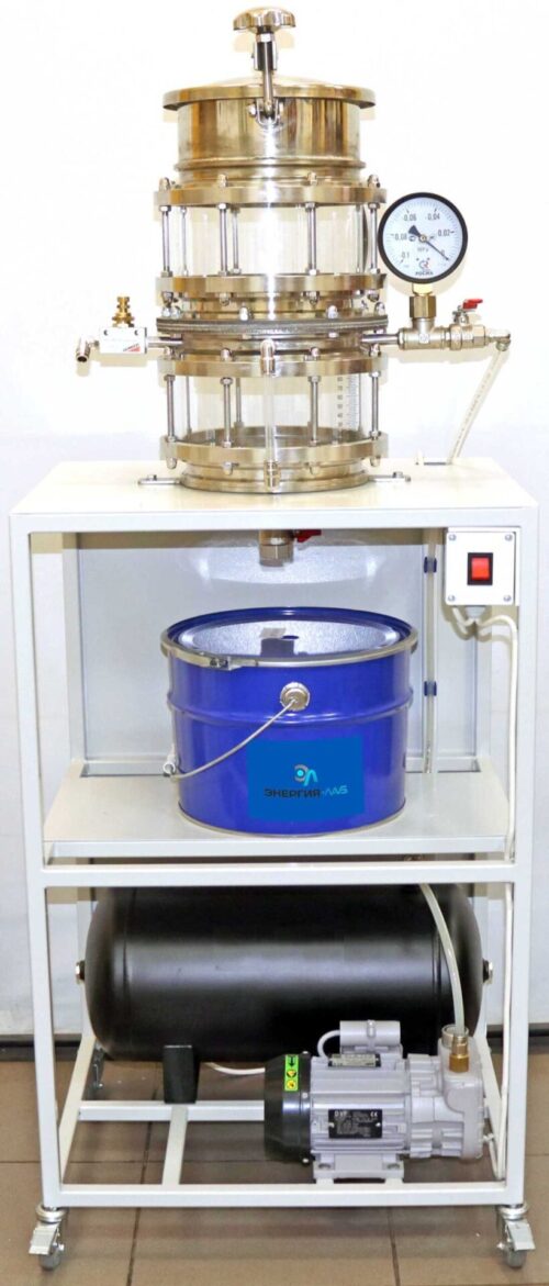 Стенд представляет собой рамное основание, выполненное из металлического профиля покрашенного порошковой краской. Основание имеет поворотные колесные опоры с тормозами. На рамном основании смонтирован вакуумный насос, способный создать разрежение, колба для фильтрации из прозрачного материала, состоящая из двух частей, соединение колбы осуществляется при помощи фланцевого соединения, в нижнюю часть колбы врезаны отводы для слива и подключения вакуумного насоса. Так же в нижней части имеется индикация уровня жидкости, между фланцевым соединением колбы устанавливается перфорированная решетка, фильтрующий элемент и резиновая прокладка, верхняя часть колбы имеет крышку.