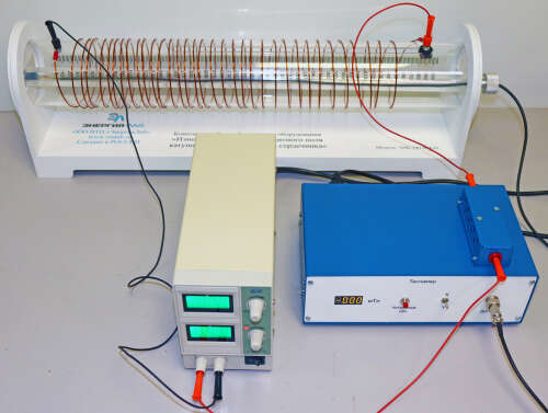 Комплект учебно-лабораторного оборудования предназначен для проведения лабораторно-практических занятий по дисциплине "Физика: электричество и магнетизм" с целью изучения зависимости индукции магнитного поля катушки индуктивности от силы тока и длины катушки.