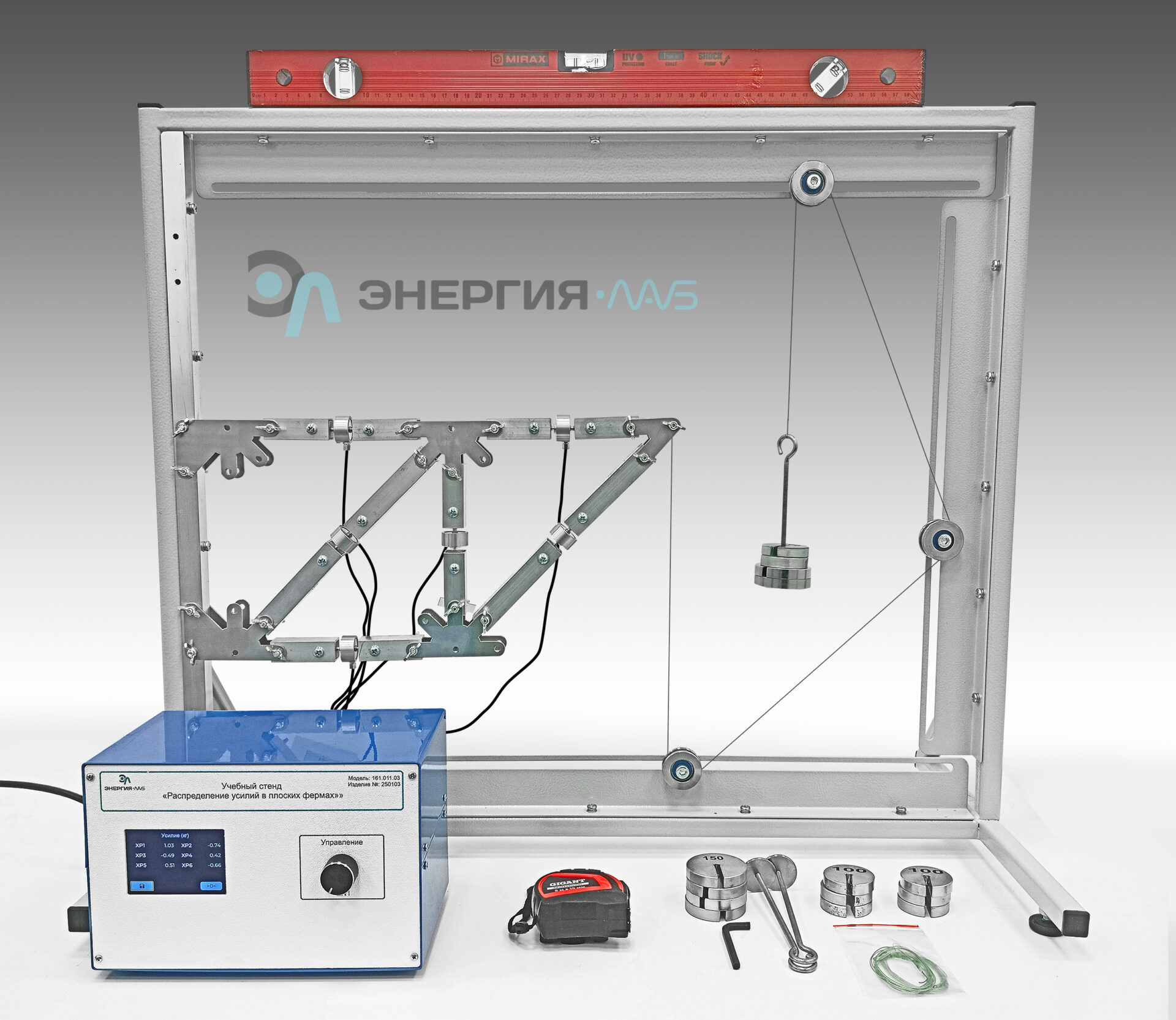 Учебная лабораторная установка позволяет определять распределение усилий в плоских фермах при различных вариантах нагружения и различных конфигурациях ферм. Стенд может быть использован при проведении лабораторных работ по курсу «Техническая механика».