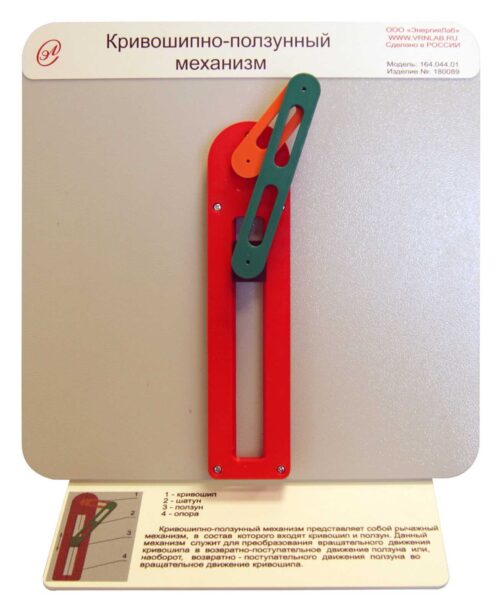 Данная модель служит для демонстрации преобразования вращательного движения кривошипа в возвратно-поступательное движение ползуна или, наоборот, возвратно-поступательного движения ползуна во вращательное движение кривошипа.