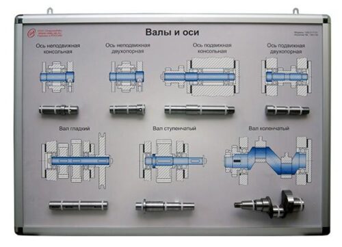 Планшет формата А1 (841 х 594 мм) с возможностью использования в настенном и настольном вариантах с закрепленными на нем образцами валов и осей.