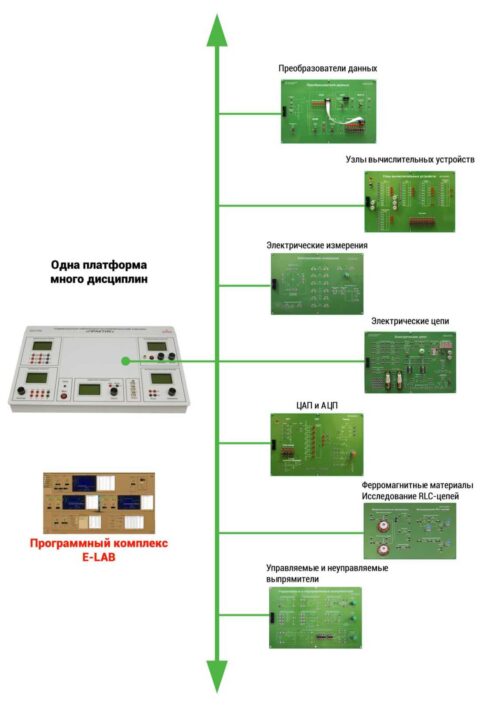 Учебная лаборатория по электротехнике представляет собой универсальный измерительный комплекс для инженерного образования «Практик» с комплектом сменных модулей. Состав модулей в комплекте и количество комплектов формируется по условиям заказчика.