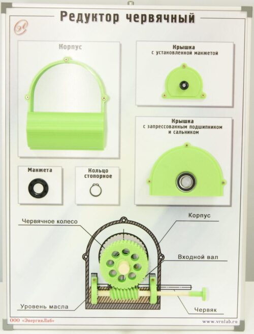 Планшет формата А2 (594x420 мм) с возможностью использования в настенном и настольном вариантах с закрепленными на нем всеми элементами червячного редуктора в разрезе в сборе. Позволяет изучать принцип действия и устройство редуктора. Червячная передача установлена вне корпуса с возможностью измерения геометрических параметров зацепления, определения передаточного отношения методами вращения вала и через числа зубьев зубчатых колес. Планшет изготовлен из фанеры толщиной 8 мм, с наклеенным на неё пластиком ПВХ 1мм с нанесением цветной термопечати. По периметру планшет окантован алюминиевым профилем. Верхний профиль имеет подвесы для крепления планшета к стене шурупами диаметром 3 мм.