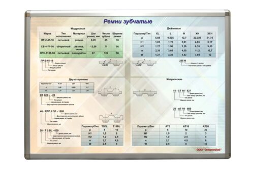 Плакат формата А1 с возможностью использования в настенном и настольном вариантах. На плакате размещена классификация, обозначения и образцы зубчатых ремней в натуральную величину, а именно: