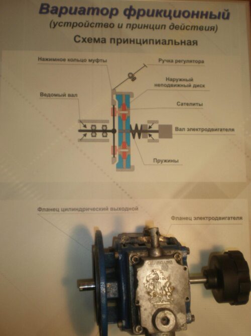 Плакат-планшет позволяет изучать устройство и принцип работы фрикционного вариатора. На плакате изображена кинематическая схема вариатора, которая позволяет определять передаточное отношение, движение всех деталей.