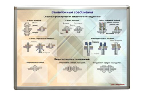 Плакат формата А1 с возможностью использования в настенном и настольном вариантах с закрепленным на нем натуральными образцами типовых заклепочных соединений, изготовленных из металла (сталь-алюминий). На плакате изображены виды заклепочных соединений (соединения внахлестку, с одной наладкой, с двумя накладками), способы формирования заклепочного соединения (клепка обжимом, взрывом, обжимом шайбы, стержневых заклепок). Планшет изготовлен из фанеры с наклеенной на нее подложкой из пластика с полноцветной печатью. По периметру плакат окантован алюминиевым профилем. Верхний профиль имеет подвесы для крепления планшета к стене. Подвес, в виде петли, вставляется в паз, расположенный на задней стороне профиля и крепится с помощью винта, что позволяет регулировать расстояние между подвесами. Подвешивается на винт, закрепленный в стене.