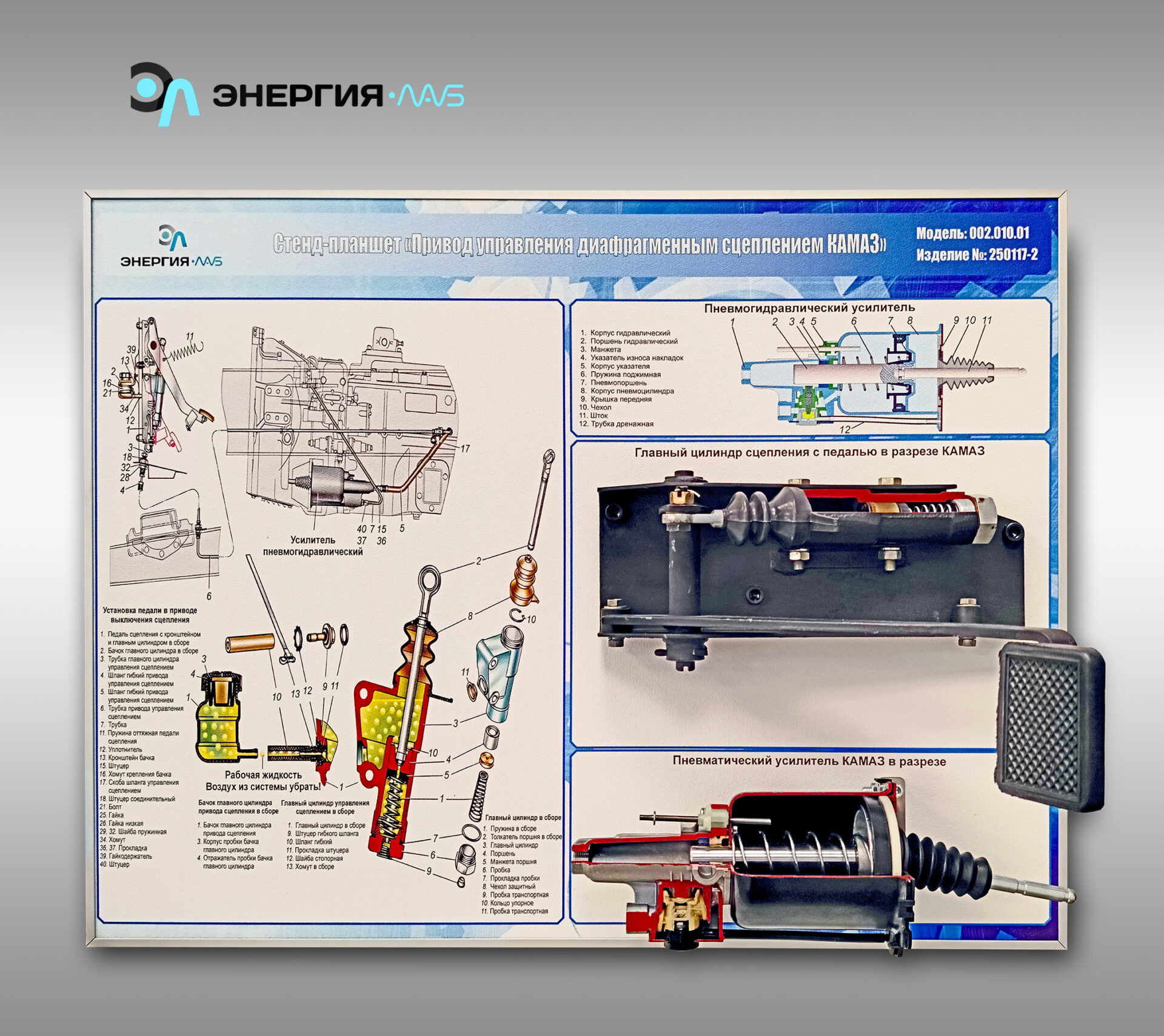 Стенд-планшет «Привод управления диафрагменным сцеплением КАМАЗ» предназначен для наглядного изучения устройства, кинематической схемы и принципа работы системы привода диафрагменного сцепления автомобилей марки КАМАЗ. Это современное учебное оборудование используется в образовательных учреждениях (колледжах, автошколах, ВУЗах), а также в учебных центрах предприятий для подготовки и повышения квалификации специалистов по обслуживанию и ремонту грузовой автомобильной техники. Стенд позволяет в деталях рассмотреть все ключевые компоненты системы в статичном положении, что способствует лучшему усвоению теоретического материала.