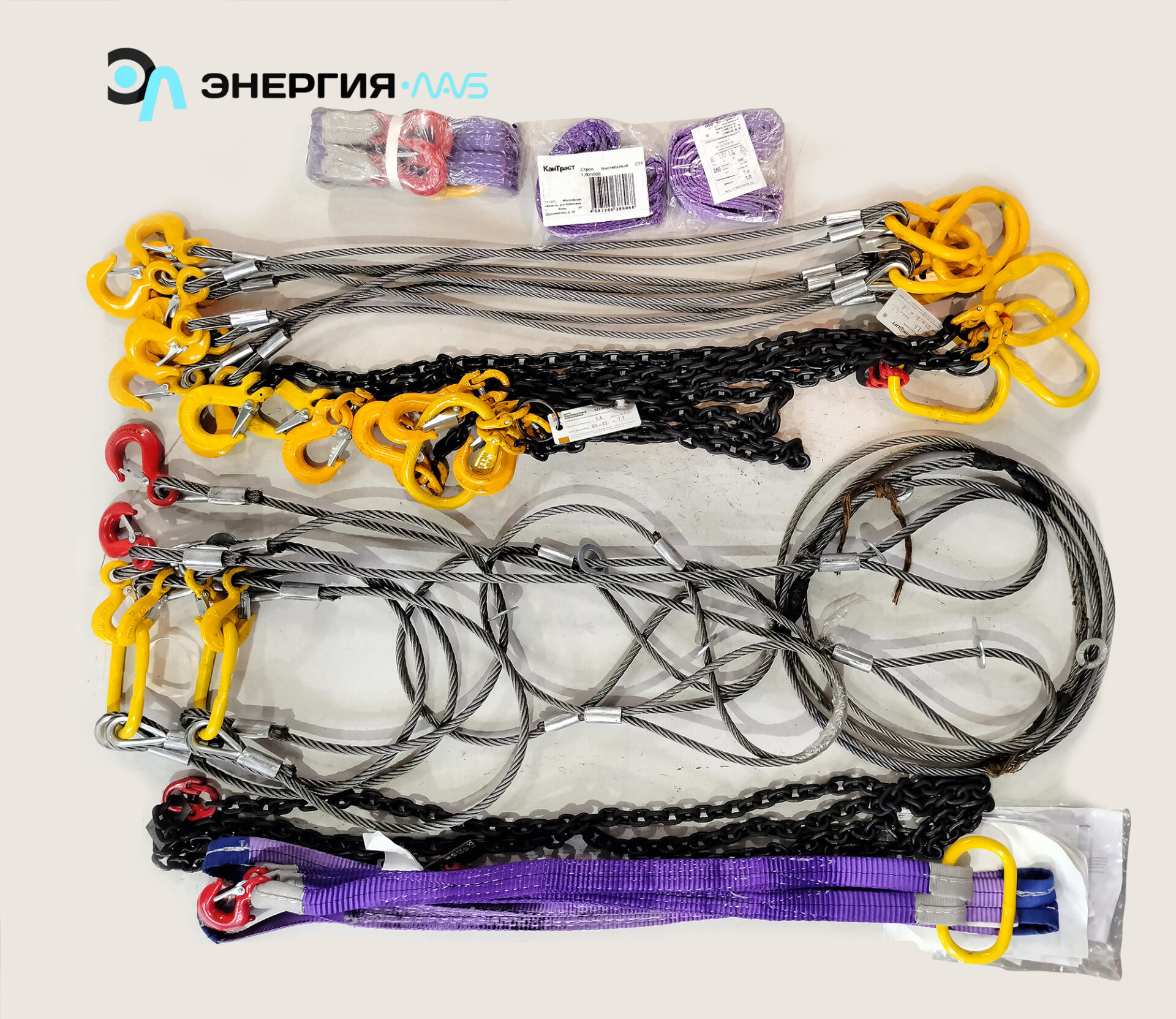 - Набор стропов (1 комплект): Стропы канатные (двухпетлевые, кольцевые, одноветвевые, двухветвевые, четырехветвевые), цепные (кольцевые, одноветвевые, двухветвевые), текстильные (двухпетлевые, кольцевые, двухветвевые) – по 2 шт. каждого типа.