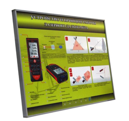 Электрифицированный стенд представляет собой информационную панель с раздельной световой индикацией. На стенде представлена информация об устройстве и принципе работы лазерного дальномера, а также о его основных конструктивных элементах. В конструкцию учебного оборудования интегрированы магниточувствительные сенсоры для управления стендом при помощи интерактивного воздействия приемо-передающих устройств. Предусмотрено два режима работы со стендом: "Обучение" и "Контроль".