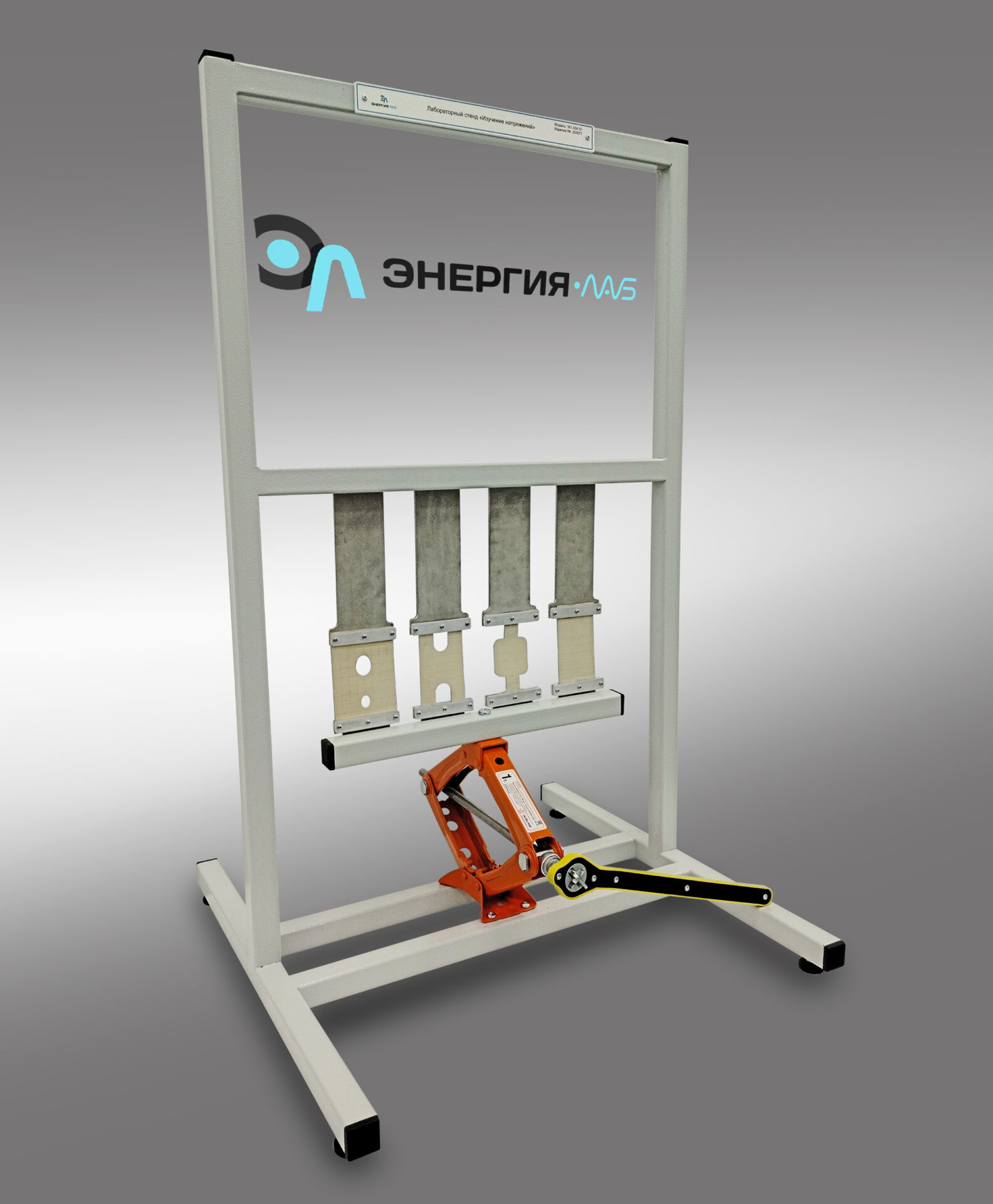 Стенд "Изучение напряжений" представляет собой сварную раму, основание, зажимные пластины, устройство для создания нагрузки, маховик, образцы.