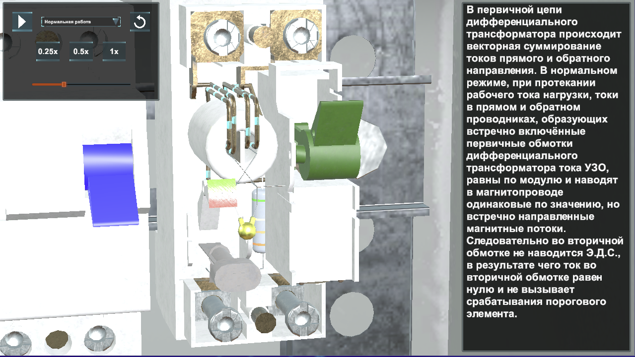 Программа позволяет детально изучить внутреннее устройство УЗО в интерактивном режиме, а также провести виртуальные опыты по определению условий и времени срабатывания защиты при различных параметрах сети и утечки тока.