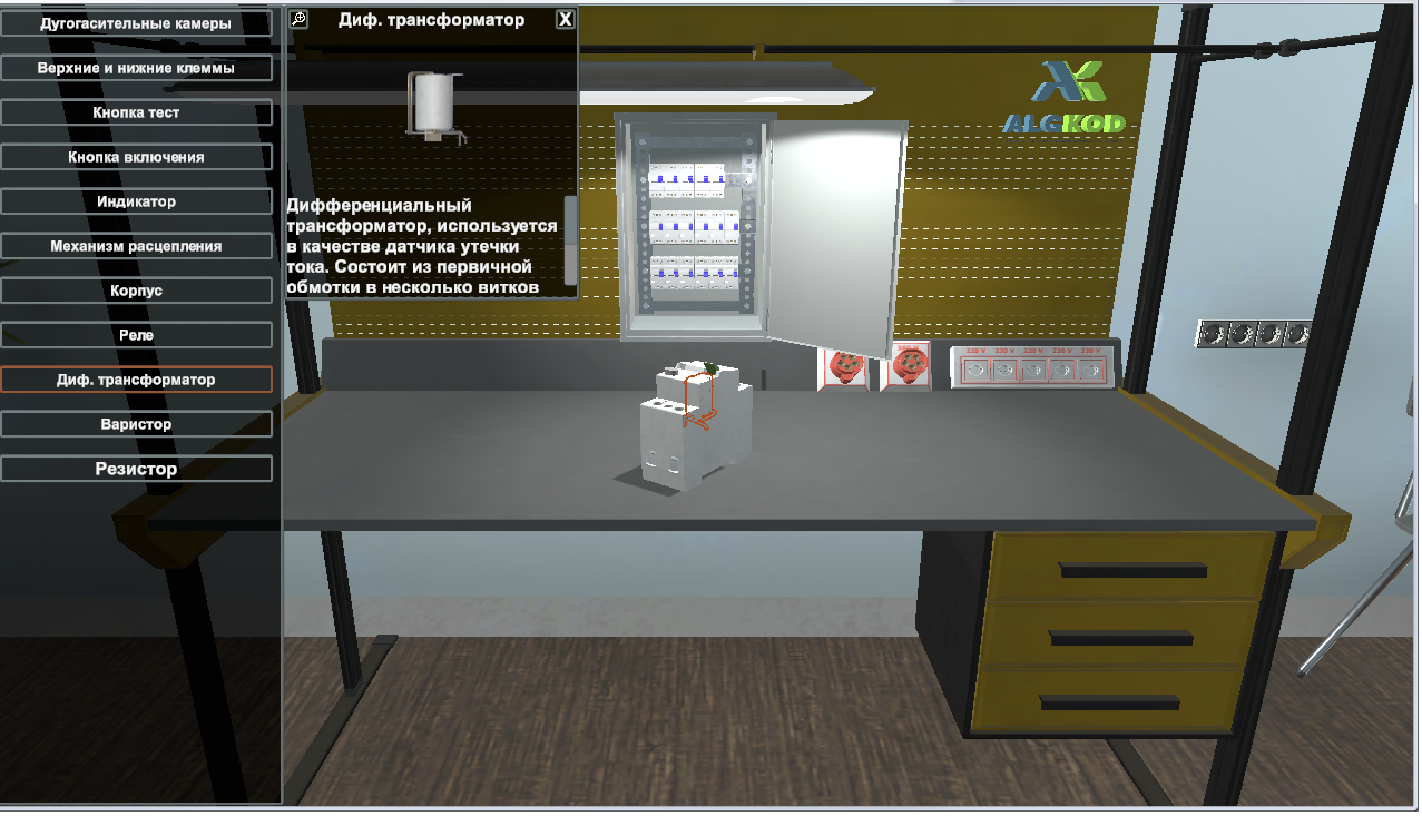 Виртуальный лабораторный практикум — это интерактивная мультимедийная программа, созданная для глубокого изучения устройства и принципа действия УЗО (устройства защитного отключения). Она сочетает в себе теоретический материал, справочные данные и практические эксперименты в реалистичной 3D-среде.