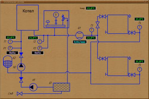 Информационно-измерительная система обеспечивает определение температуры жидкости на входе и выходе в устройство (котел), расход жидкости и давление.