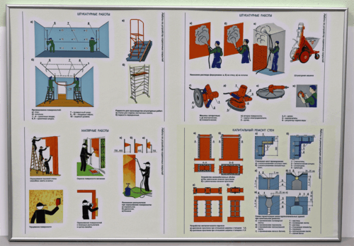 - Макеты стен с отделкой штукатурки – кирпичные стены, стеновые перегородки из ГКЛ. Макеты позволяют поэтапно изучить процесс подготовки стен, нанесение штукатурных смесей различными способами, финишную отделку стен.