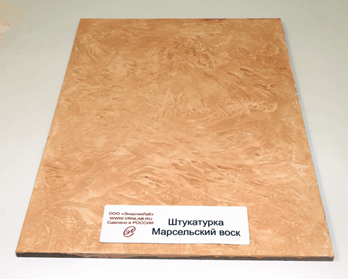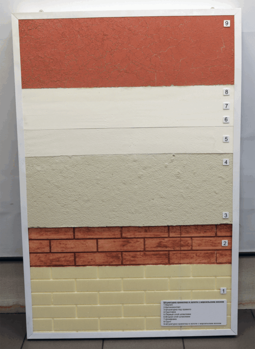 - Образец штукатурки нанесен на деревянную табличку, закрепленную на композитной панели.