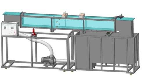 Проточная часть является основным элементам для проведения лабораторных работ. Проток представляет собой, сварную конструкцию из стали, с прозрачными вставками из акрилового материала, с механизмом качения и опорой для домкрата, также в конструкции имеются фланцы для присоединения напорного и сточного баков. В боковых частях протока, имеется механизм фиксации предназначенный для установки различных видов водосливов, разделителей и порогов. На выходе проточной части установлена механическая задвижка, изменение положения производятся при помощи рукоятки. Изменение угла наклона проточной части производится с помощью подъемного механизма. Измерение скорости потока осуществляется трубкой Пито.